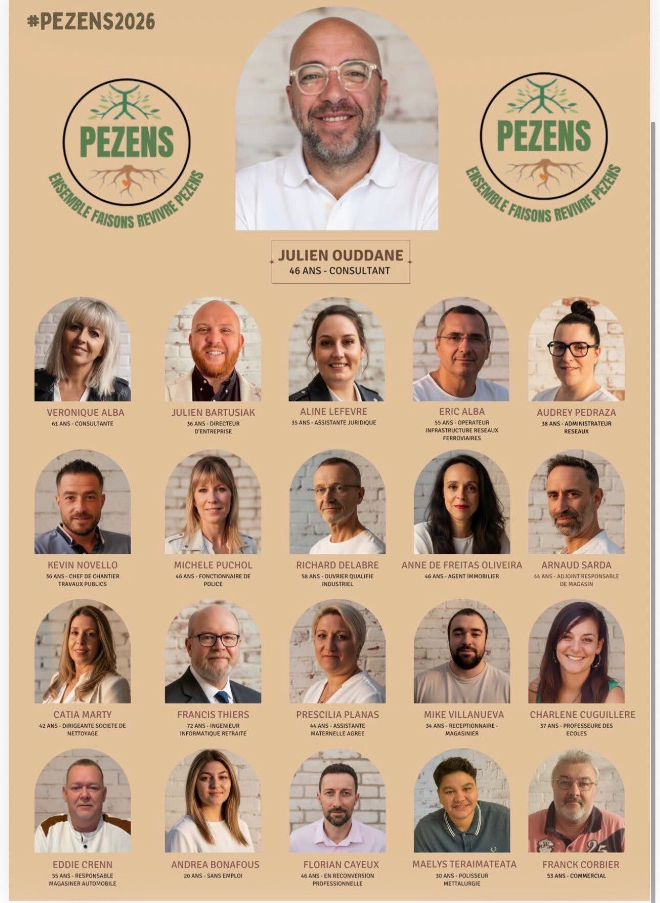 Notre équipe est composée de Pezénois et Pezénoises de tous horizons, unis par une passion commune pour notre village. Nous nous engageons à travailler main dans la main avec vous, à l'écoute de vos besoins et de vos préoccupations. Notre priorité est de construire un avenir meilleur pour tous les habitants de Pezens, en plaçant l'humain au cœur de chaque décision.